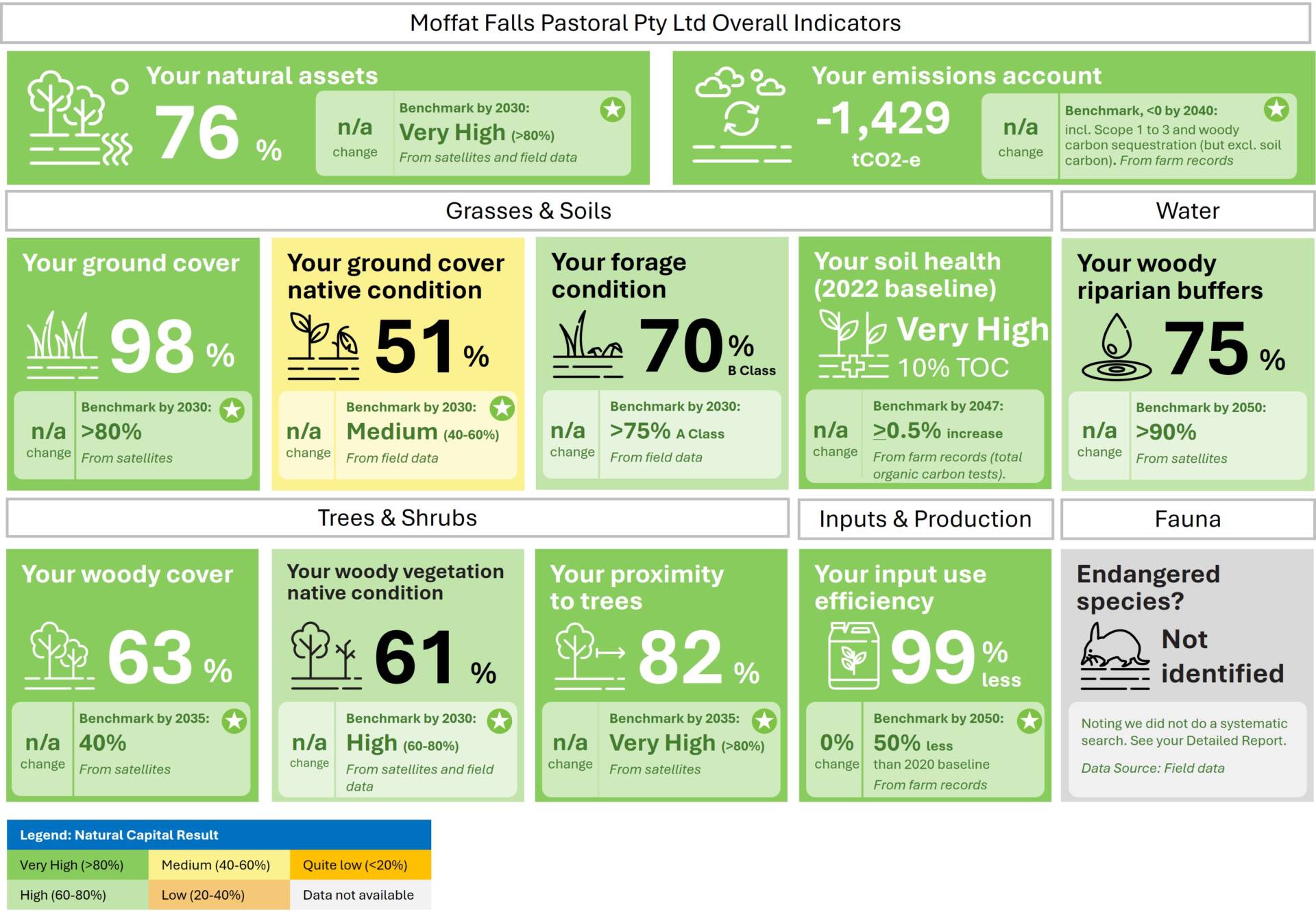 Snapshot from the Moffat Falls Natural Capital Report, which showcases some of the indicators used for assessing the state of natural capital on the farm relevant to the bio-region’s potential. These metrics cover grasses and soils, water, trees and shrubs, inputs and production, and fauna (not yet measured in this instance).